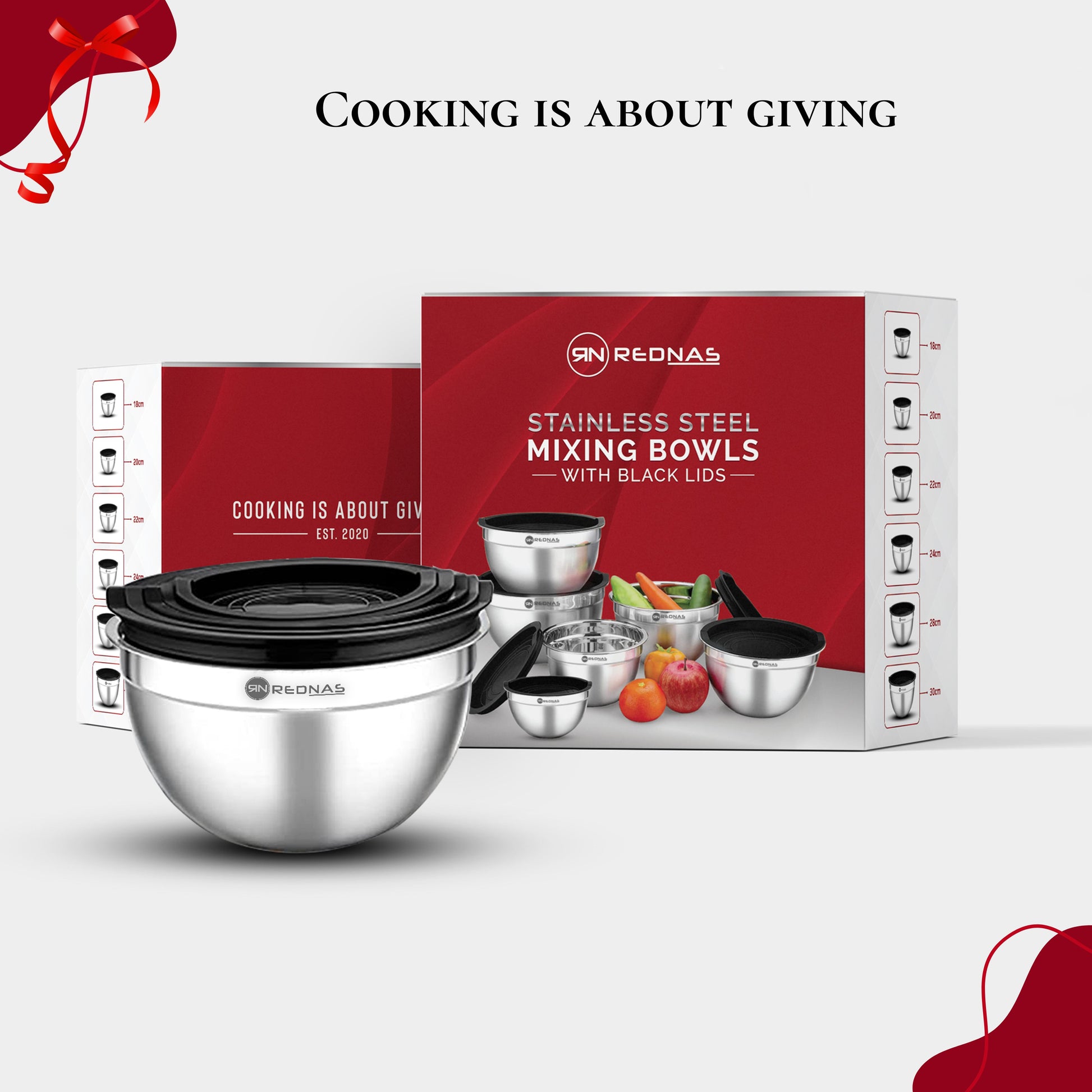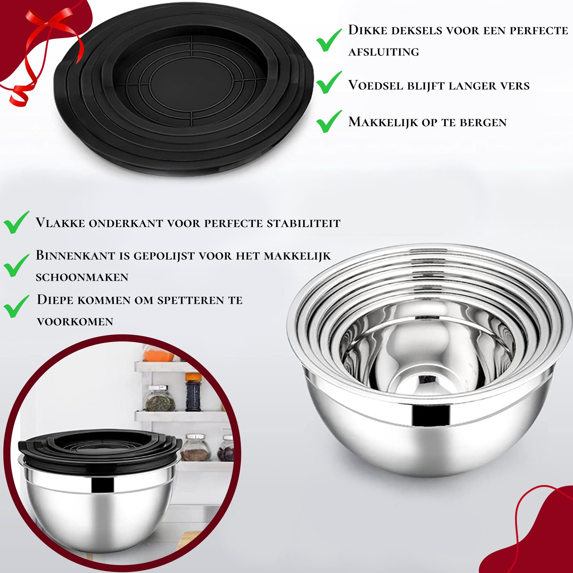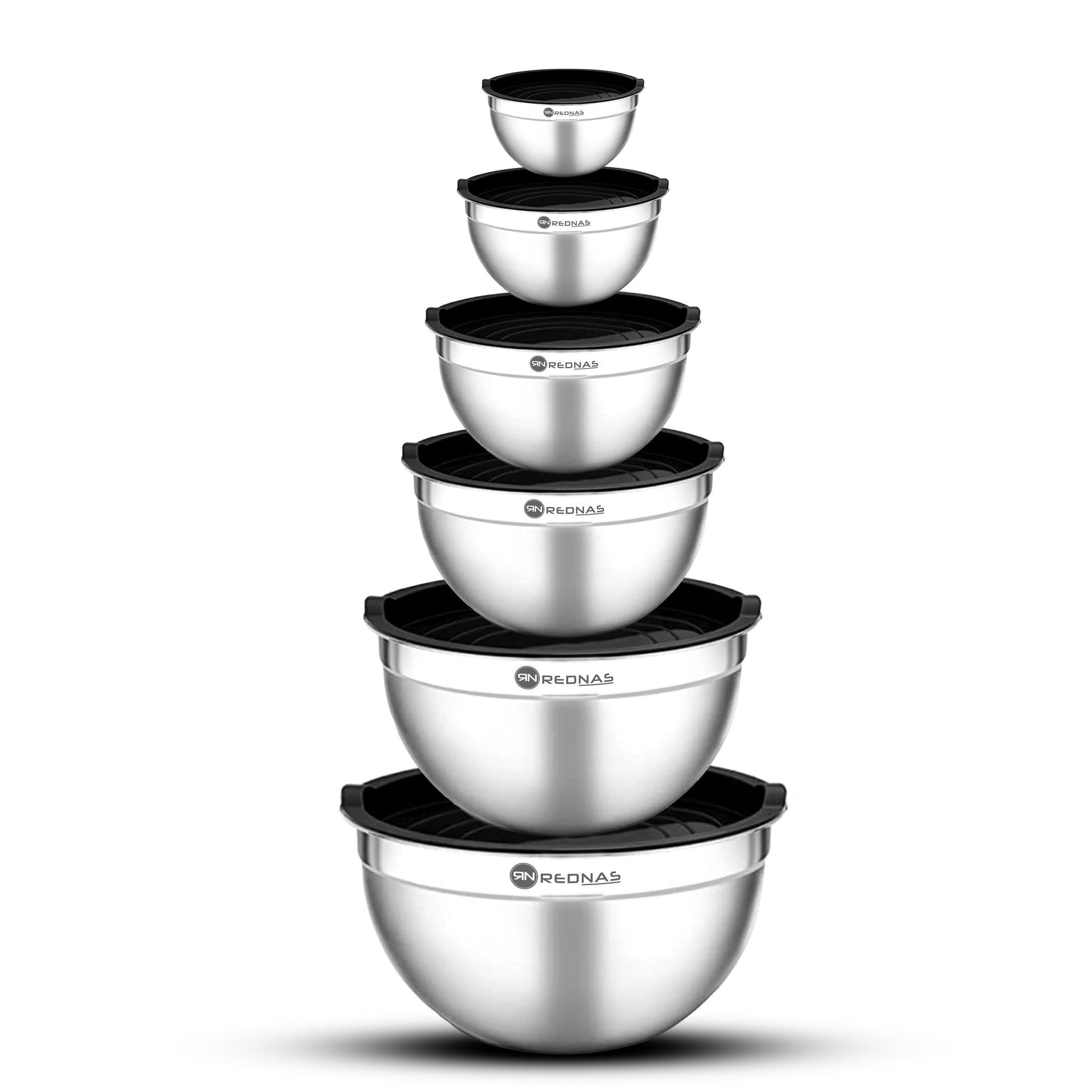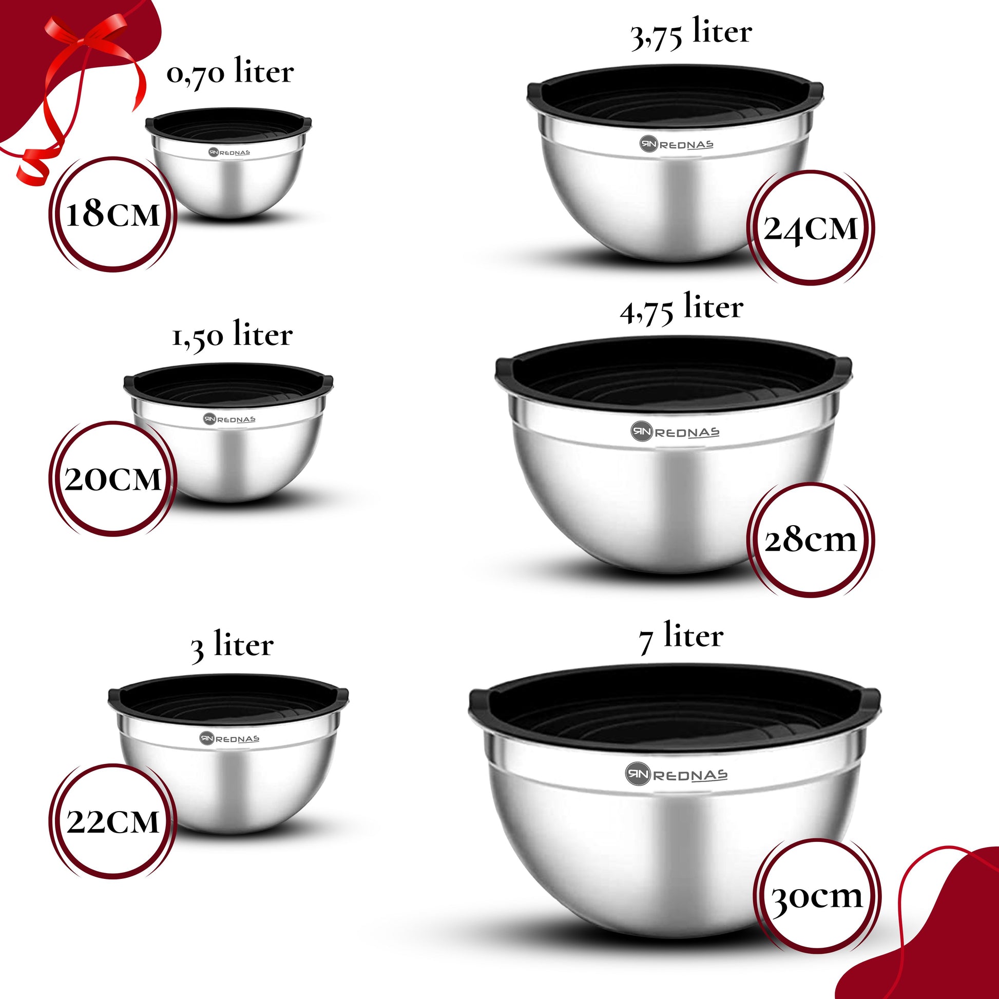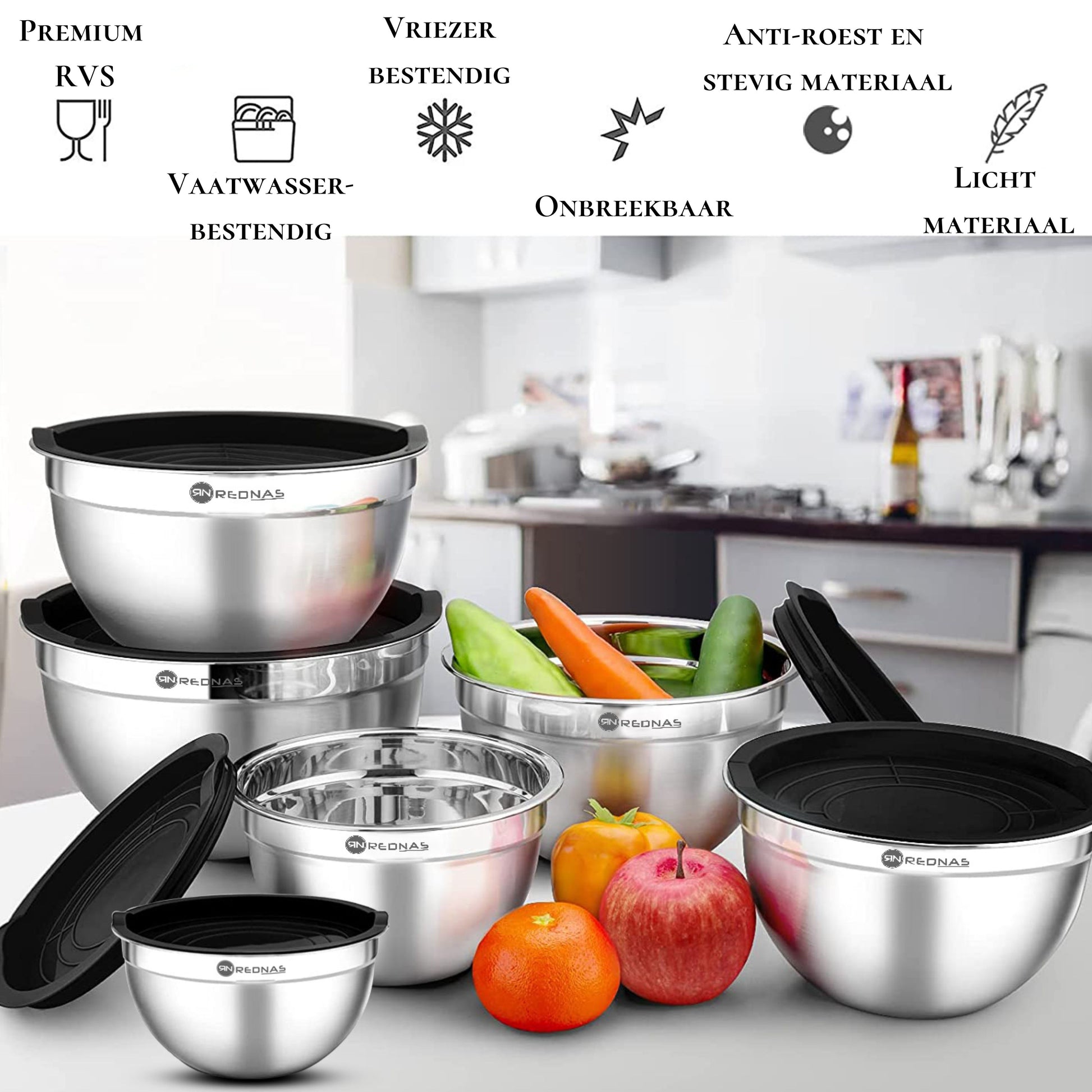 Je gebruikt ze overal voor: de Rednas beslag-/bewaar-/serveer-/mengkommen. Of het nu is voor het mixen van beslag, het marineren van vlees, het serveren van salades of voor de schillen van je aardappelen. Deze Rednas Beslagkommen met luchtdichte deksels zijn van de hoogste kwaliteit RVS en staan straks dagelijks op jouw aanrecht. De mengkomset bestaat uit 6 kommen van verschillende formaten: 0.7 liter, 1.5 liter, 3 liter, 3.75 liter, 4.75 liter en 7 liter. Zo heb je voor elk onderdeel van je gerecht een handige mengkom paraat, zonder dat je tussendoor hoeft af te wassen. Handig hè!