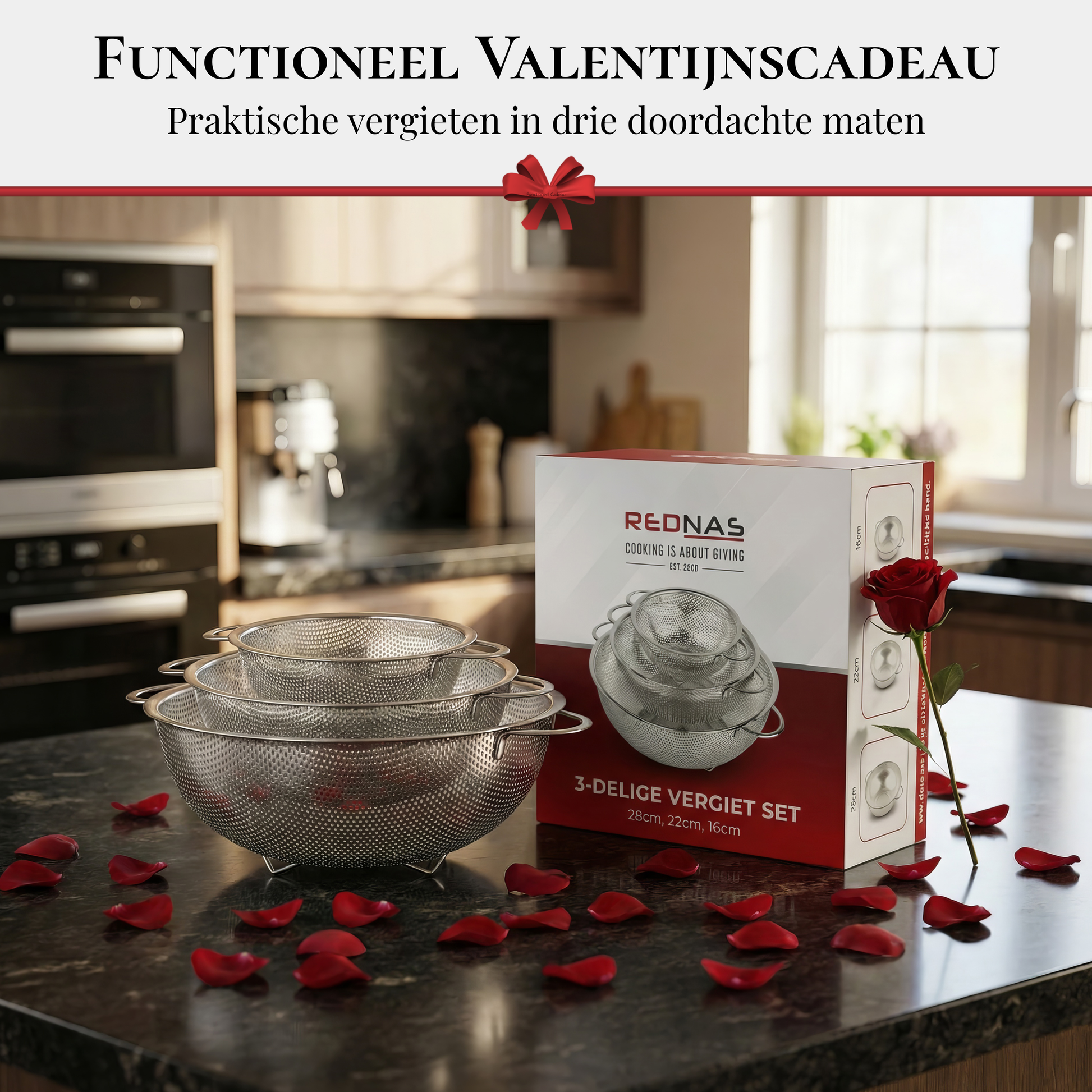 Zoals elk Rednas-product is ook deze vergietset ontworpen om koken mooier, eenvoudiger en persoonlijker te maken. Niet alleen voor jezelf, maar juist om te delen met anderen.