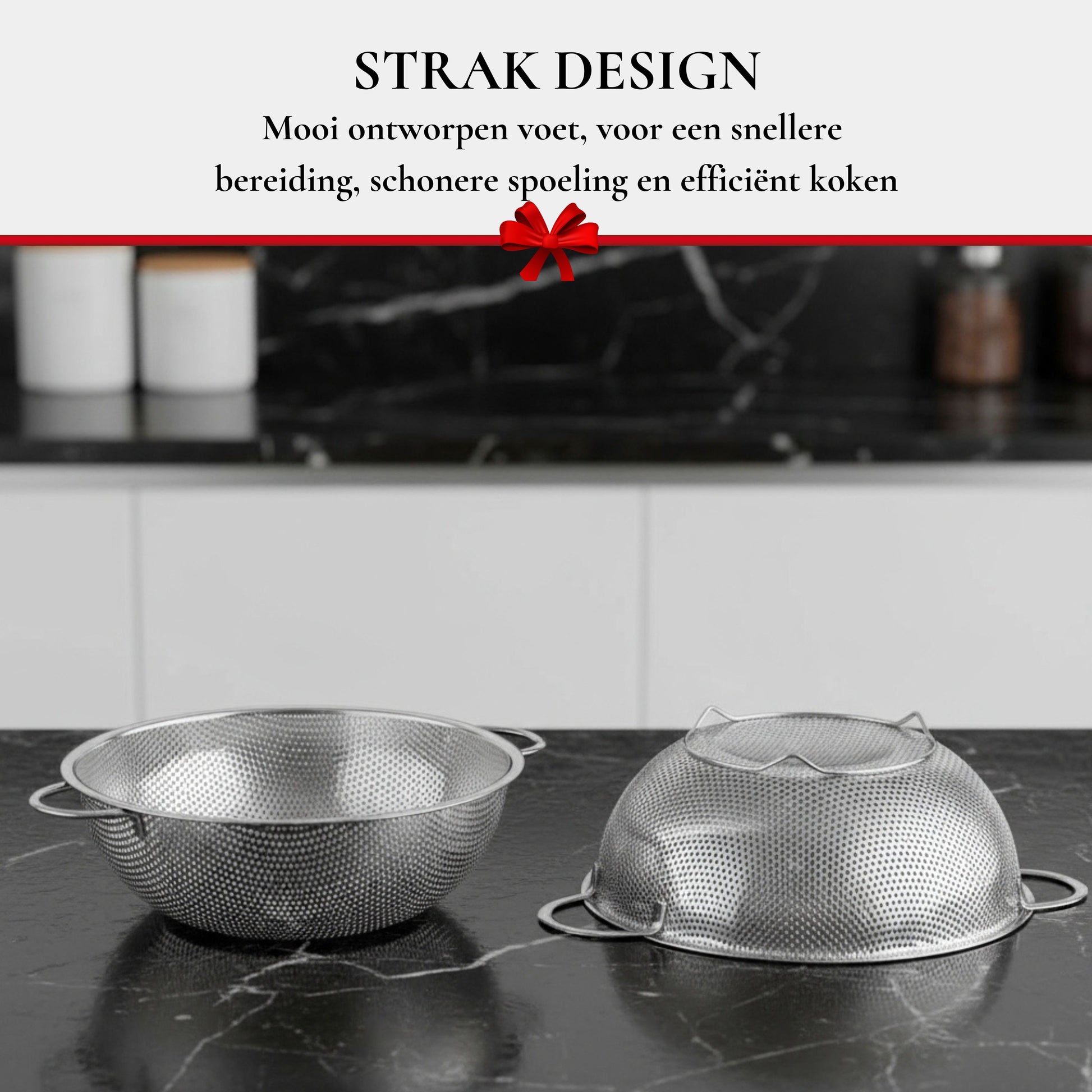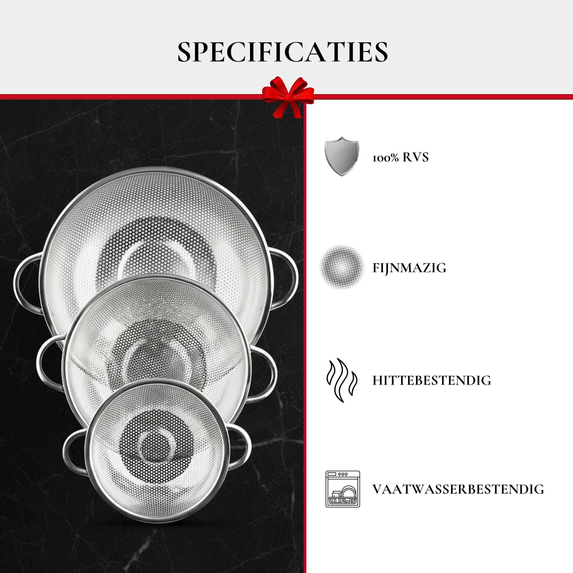 De vergieten zijn gemaakt van 100% roestvrij staal (RVS) en voorzien van een fijnmazige zeefstructuur. Hierdoor zijn ze geschikt voor: