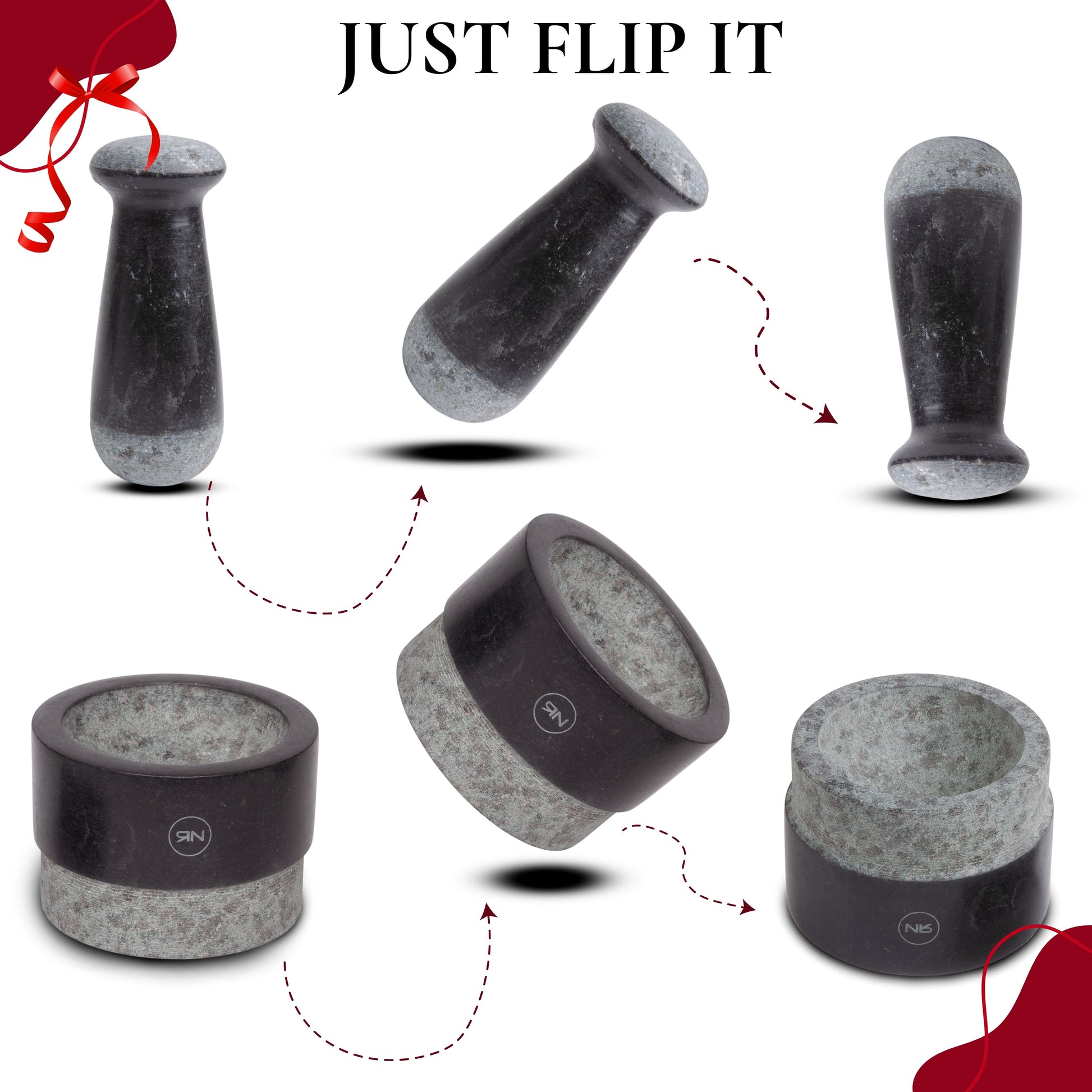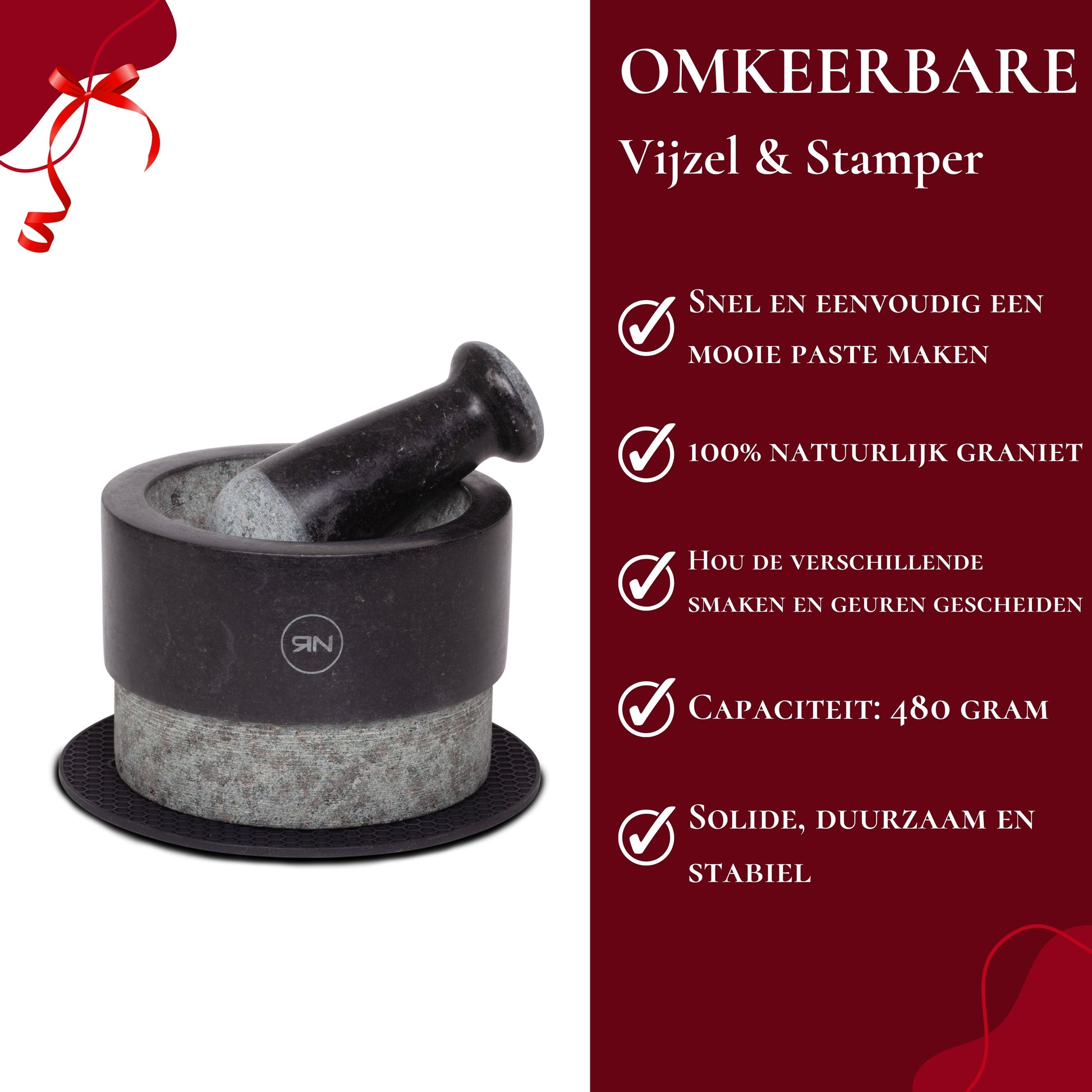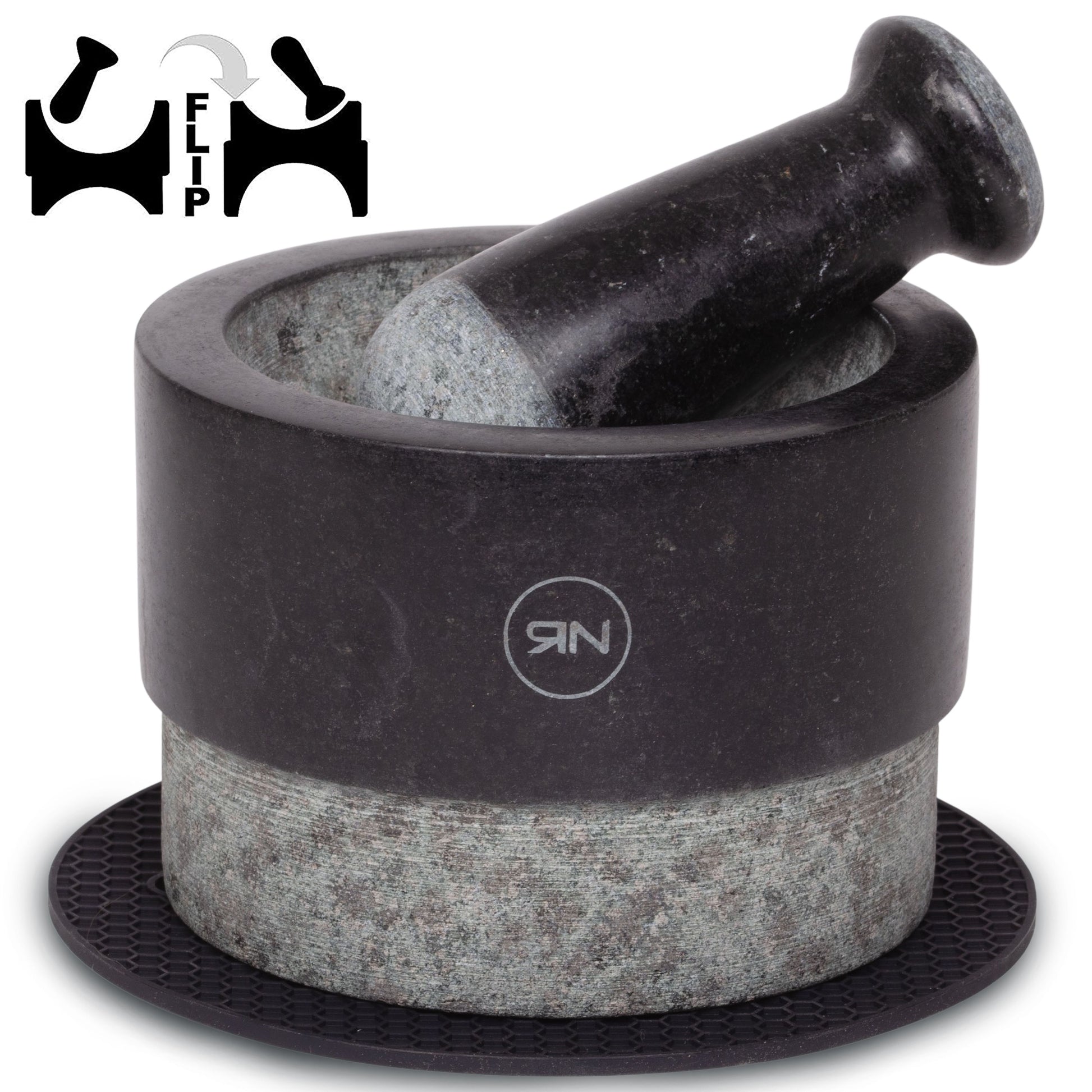 Ontdek onze veelzijdige omkeerbare vijzel en stamper, essentieel voor elke keuken. Het unieke design behoudt de pure smaken zonder vermenging. Gemaakt van massief graniet voor levenslang plezier en stabiliteit. Het elegante design past naadloos op je aanrecht, inclusief siliconen anti-slipmat voor extra bescherming.